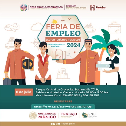 Oaxaca, Oaxaca, Viernes 05 de Julio, 2024 (Fuente: Comunicado).- El próximo jueves 11 de julio se llevará a cabo la Feria de Empleo Sector Turístico Huatulco 2024 en la que se ofertarán 280 vacantes y participarán 20 empresas locales, principalmente de los destinos turísticos de la región de la Costa.