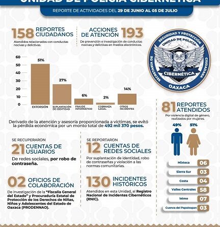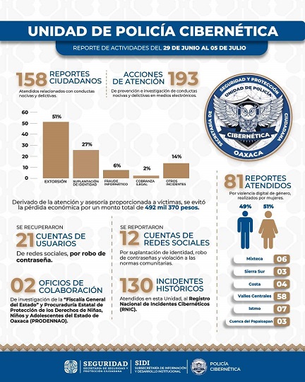 A través de la Unidad de Policía Cibernética (UPC), se desplegaron del 29 de junio al 5 de julio, un total de 193 acciones de atención, prevención e investigación de conductas nocivas y delictivas en medios electrónicos, al tiempo que recibió 158 reportes ciudadanos relacionados con este tipo de delitos.