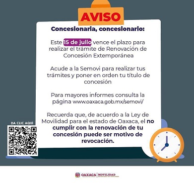 Oaxaca, Oaxaca, Jueves 11 de Julio, 2024 (Fuente: Comunicado).- La Secretaría de Movilidad (SEMOVI) exhorta a las personas concesionarias a que realicen la renovación y actualización de sus títulos, ya que este 15 de julio vence el plazo para el trámite extemporáneo y expira el programa de estímulos económicos para diversos trámites del transporte público.
