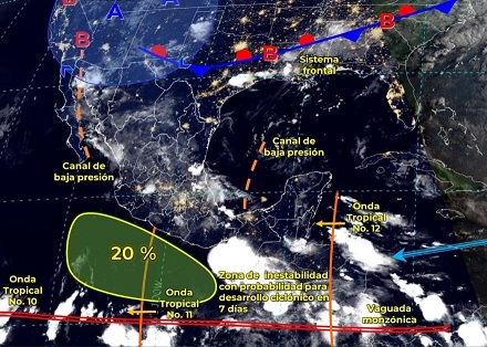 De acuerdo con el pronóstico del tiempo emitido por la Comisión Nacional del Agua (Conagua) varios sistemas meteorológicos como canales de baja presión y la afluencia de humedad que aporta el Océano pacífico y Golfo de México, así como el borde delantero de la onda tropical número 12, influenciarán la presencia de lluvias.