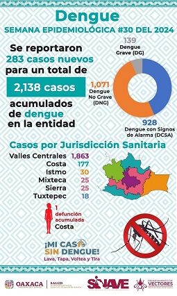 Oaxaca, Oaxaca, Jueves 01 de Agosto, 2024 (Fuente: Comunicado).- Tras dar a conocer 283 casos nuevos de dengue, para un total de 2 mil 138 acumulados en lo que va del año, y ante la continuidad de lluvias en gran parte de la entidad, Servicios de Salud de Oaxaca (SSO) exhortó a la población a reforzar las medidas preventivas contra la proliferación del mosquito Aedes aegypti.