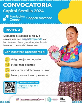 Oaxaca, Oaxaca, Miércoles 14 de Agosto, 2024 (Fuente: Comunicado).- Para impulsar el crecimiento de las micro y pequeñas empresas oaxaqueñas, la Secretaría de Desarrollo Económico (SEDECO) junto a Fundación Coppel invitan a participar en la Convocatoria “Capital Semilla” de Emprende Coppel, que brindará capacitaciones y apoyos en especie de forma gratuita.