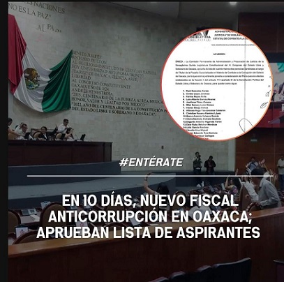Oaxaca, Oaxaca, Jueves 22 de Agosto, 2024 (Fuente: Jaime Guerrero / El Piñero y Agencias).- Un total de 19 personas se registraron para participar en el proceso de designación de la persona titular de la Fiscalía Especializada en Materia de Combate a la Corrupción del estado de Oaxaca, entre las que destacan funcionarios del Congreso local, de la Secretaría de Educación Pública (SEP), una regidora del municipio de Huajuapan de León y un inhabilitado por la Secretaría de la Función Pública (SFP).