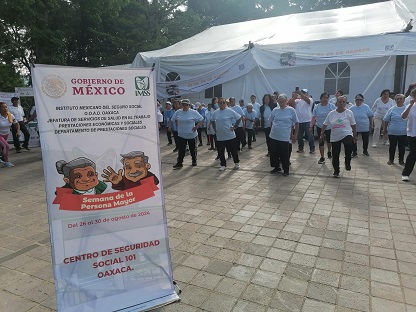 Oaxaca, Oaxaca, Martes 27 de Agosto, 2024 (Fuente: Comunicado).- Como parte de las acciones de la Semana del Adulto Mayor, del 26 al 30 de agosto, bajo el lema «Decenio de Envejecimiento Saludable», el Instituto Mexicano del Seguro Social (IMSS) en Oaxaca realizó una actividad física en el Paseo Juárez (El Llano) con la participación de 100 personas.