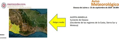 Oaxaca, Oaxaca, Jueves 26 de Septiembre, 2024 (Fuente: Comunicado).- El Consejo Estatal de Protección Civil informa que la tormenta tropical “John” se regeneró y se encuentra frente a las costas de Guerrero, por lo que se mantiene en alertamiento máximo por lluvias a las regiones del Istmo, Costa, Sierra Sur, Sierra de Juárez, Mixteca y Valles Centrales.