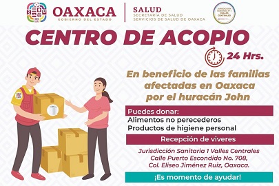De igual modo, el Consejo Estatal de Protección Civil a través de Servicios de Salud de Oaxaca (SSO), habilitó cuatro centros de acopio en las sedes Jurisdiccionales de Valles Centrales, Istmo, Mixteca y Sierra, como un esfuerzo solidario y humanitario para ayudar a quienes resultaron afectados por el paso del huracán “John”.