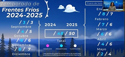 De acuerdo con la información emitida por el Servicio Meteorológico Nacional (SMN), se pronostica el arribo a México de 48 frentes fríos, así como el desarrollo de siete tormentas invernales en el periodo de septiembre de 2024 a mayo de 2025.