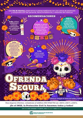 Oaxaca, Oaxaca, Martes 22 de Octubre, 2024 (Fuente: Comunicado).- En el marco de la celebración del Día de Muertos, el Instituto Mexicano del Seguro Social (IMSS) en Oaxaca, hace un llamado a la población para disfrutar de estas importantes tradiciones con responsabilidad, adoptando medidas de seguridad que permitan reducir riesgos y salvaguardar la integridad de las familias.