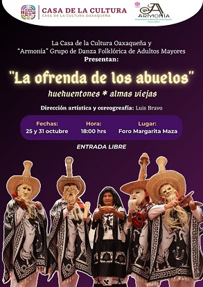 En la misma fecha, a las 18:00 horas, la CCO y el Grupo de Danza Folklórica de Adultos Mayores «Armonía» presentarán “La ofrenda de los abuelos” dirigida por Luis Bravo, la cual será una muestra de danza de huehuentones, baile tradicional de Huautla de Jiménez que evoca a los espíritus o almas que regresan en esta temporada de muertos. Se realizará en el foro Margarita Maza en el edificio de la institución.