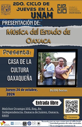 El 24 de octubre a las 16:00 horas, en el marco del Segundo Ciclo de Jueves en la UNAM, en colaboración con la CCO, se presentará “Música del Estado de Oaxaca» a cargo de Joaquín Santiago López; músico, ejecutante y director musical, así como de Miguel Ángel Cruz López, guitarrista y poeta.