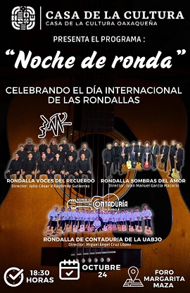 Para festejar el Día Internacional de las Rondallas, en la misma fecha, a las 18:30 horas, en el foro Margarita Maza de la CCO, ubicada en González Ortega número 403, en la ciudad de Oaxaca, se presentarán los grupos Voces del Recuerdo, Sombras del Amor y la Rondalla de la Contaduría de la UABJO. Esta actividad forma parte del programa “Noche de ronda” para celebrar la herencia de este estilo musical.