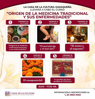 Como parte del curso «Origen de la medicina tradicional y sus enfermedades», se llevará a cabo el tercer módulo titulado «El susto y el espanto», el 25 de octubre de 16:00 a 17:30 horas, en la sala Andrés Henestrosa.