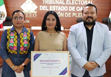 En instalaciones del Tribunal, el Comisionado Presidente del OGAIPO, Josué Solana Salmorán y la Comisionada Claudia Ivette Soto Pineda, entregaron a la Magistrada Presidenta del TEEO, Elizabeth Bautista Velasco, el Reconocimiento por el Micrositio «Igualdad y género».