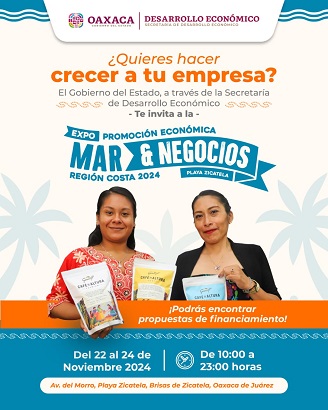 Oaxaca, Oaxaca, Lunes 18 de Noviembre, 2024 (Fuente: Comunicado).- La Secretaría de Desarrollo Económico (SEDECO) invita a la Expo Mar & Negocios que se realizará en Playa Zicatela, Puerto Escondido, del 22 al 24 de noviembre, con la participación de micro, pequeñas y medianas empresas (MIPYMES), así como personas productoras, artesanas y emprendedoras.