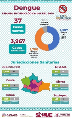 Oaxaca, Oaxaca, Jueves 21 de Noviembre, 2024 (Fuente: Comunicado).- Al corte de la semana epidemiológica número 46, Servicios de Salud de Oaxaca (SSO) informa que se registraron 37 casos nuevos de dengue, con los cuales suman tres mil 967 acumulados en toda la entidad.