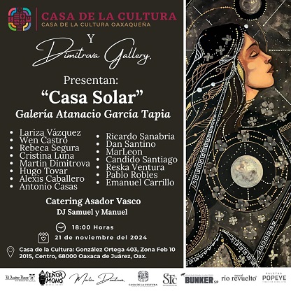 Oaxaca, Oaxaca, Jueves 21 de Noviembre, 2024 (Fuente: Comunicado).- La Casa de la Cultura Oaxaqueña (CCO), ubicada en el Centro Histórico de la capital de Oaxaca, invita al público en general a la inauguración de la Exposición Casa Solar, que se llevará a cabo este 21 de noviembre en la Galería Atanacio García Tapia, a las 18:00 horas.