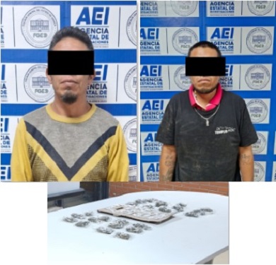 En el lugar, los elementos de seguridad detuvieron también a dos personas del sexo masculino identificadas como L.A.B.S. y L.C., quienes -junto con los objetos asegurados- fueron presentados ante la autoridad competente por el delito contra la salud en su modalidad de narcomenudeo.