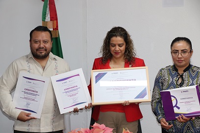 El reconocimiento por la práctica “Órdenes de protección del Poder Judicial del Estado de Oaxaca” fue entregado por manos del Comisionado Presidente Josué Solana Salmorán y la Comisionada Claudia Ivette Soto Pineda y recibido por la Presidenta del Tribunal Superior de Justicia y del Consejo de la Judicatura, la Magistrada Berenice Ramírez Jiménez.