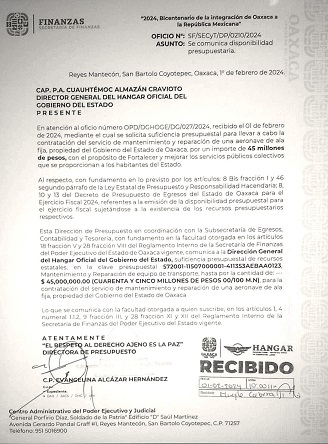 El día 1 de febrero del 2024, con el oficio número SF/SECyT/DP/0210/2024, la Secretaría de Finanzas comunicaba a la dirección del Hangar Oficial del gobierno del estado la disponibilidad presupuestaria de 45 millones de pesos para reparar el avión Hawker 400XP.