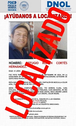 Oaxaca, Oaxaca, Martes 10 de Diciembre, 2024 (Fuente: Comunicado).- La aplicación de protocolos de investigación que realiza la Fiscalía General del Estado de Oaxaca (FGEO) hicieron posible dar con el paradero de una persona del sexo masculino identificado como R.R.C.H., quien estaba reportado como No Localizado, hechos que sucedieron en la región de los Valles Centrales.