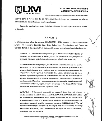 Oaxaca, Oaxaca, Jueves 12 de Diciembre, 2024 (Fuente: Carina García / X: @CariGarcias).- El Congreso de Oaxaca dejó sin efecto 1344 plazas laborales de base, otorgadas dentro de los ejercicios fiscales 2016 hasta el 2022, es decir, por los exgobernadores Gabino Cué y Alejandro Murat, toda vez que, aseguran, ha comprometido las finanzas públicas de la entidad.