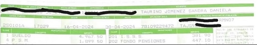 Una imagen de su sobre de cobro demuestra que su salario es de alrededor de 8 mil pesos y es nivel 10.