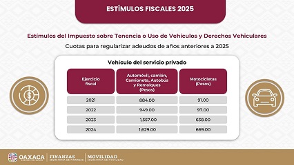 La dependencia informa que, en estos casos, las y los propietarios y/o tenedores de vehículos registrados en Oaxaca liquidarán su adeudo mediante cuotas fijas y, así, accederán al estímulo del 100 por ciento del Impuesto sobre Tenencia, Derechos de Control Vehicular, Impuesto al Desarrollo Social, así como accesorios de 2025, siempre y cuando regularicen su situación fiscal a más tardar el 19 de diciembre de 2025.