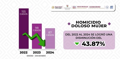En este sentido, resaltó que, a 2 años del Gobierno de la Primavera Oaxaqueña, la violencia feminicida ha disminuido un 50 por ciento; la incidencia del delito de feminicidio bajó de 40 casos en 2022 a 20 casos en 2024; el homicidio doloso de mujeres pasó de 155 casos en 2022 a 87 casos en 2024, lo que representa una disminución de 43.8 por ciento.
