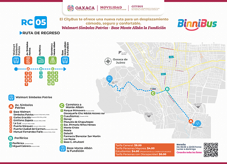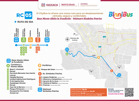 La directora del BinniBus en Oaxaca, Karina Gómez Esteban informó que la ruta RC05 brinda servicio de Monte Albán- La Fundición hacía Walmart Símbolos Patrios, en beneficio de 89 mil 216 personas, de 102 colonias, pertenecientes a los tres municipios de la Zona Metropolitana: Oaxaca de Juárez, San Antonio de la Cal y Santa Cruz Xoxocotlán.