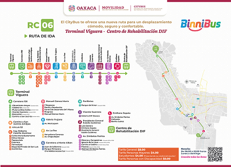 En tanto, la ruta RC06 traslada a las y los usuarios de la terminal de Viguera hacia el Centro de Rehabilitación DIF, pasando por el Centro de Desarrollo DIF Pilares, Sistema Estatal DIF Oaxaca y el Parque Primavera Oaxaqueña Cho Ndobá.