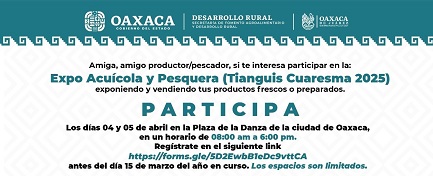 Oaxaca, Oaxaca, Viernes 14 de Marzo, 2025 (Fuente: Comunicado).- Con el objetivo de impulsar el consumo local de productos de origen acuícola y pesquero, el Gobierno del Estado, a través de la Secretaría de Fomento Agroalimentario y Desarrollo Rural (SEFADER) y en colaboración con el municipio de Oaxaca de Juárez, invita a las personas productoras y pescadoras a participar en el Tianguis Cuaresma 2025, Expo Acuícola y Pesquera.