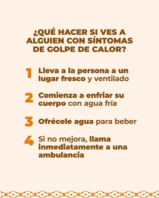 De la misma forma, se exhorta a la ciudadanía mantenerse atenta ante síntomas correspondientes a golpe de calor como: dolor de cabeza, convulsiones, pérdida del conocimiento, confusión, mareos, pulso rápido, sudoración excesiva, piel seca y caliente.