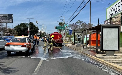 En conjunto con elementos de Protección Civil Municipal de Oaxaca de Juárez y del Heroico Cuerpo de Bomberos del Estado, se realizan trabajos de descontaminación para mitigar riesgos y garantizar la seguridad de la población.