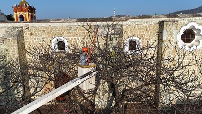 Oaxaca, Oaxaca, Miércoles 02 de Abril, 2025 (Fuente: Comunicado).- El gobierno del estado, a través de la Secretaría de Medio Ambiente, Biodiversidad, Energías y Sostenibilidad, realizó la poda fitosanitaria de los árboles emblemáticos ubicados en el atrio del templo de San Matías Jalatlaco, los cuales se encuentran catalogados desde el año 2009 como Árboles Notables en el Estado.