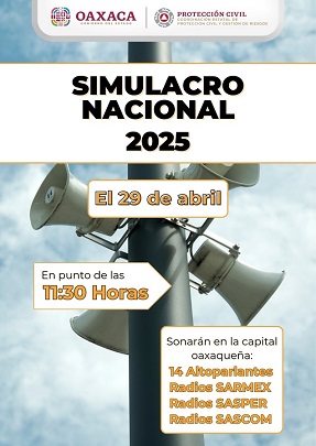 Oaxaca, Oaxaca, Jueves 03 de Abril, 2025 (Fuente: Comunicado).- Con el objetivo fomentar entre la población la cultura de la prevención para actuar ante la presencia de fenómenos sísmicos, este martes 29 de abril se realizará el Primer Simulacro Nacional 2025.
