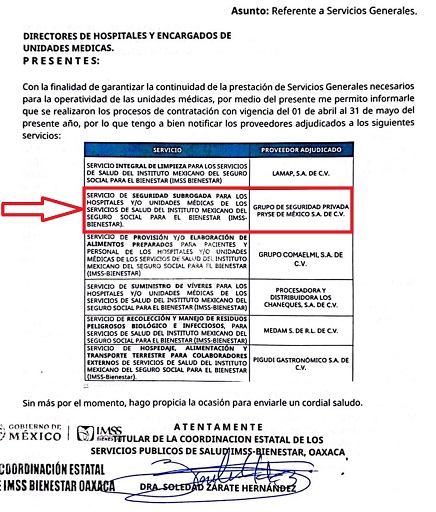 Es así que, la “primavera oaxaqueña” ya encontró otro negocio, ahora a través de la manipulable coordinadora del IMSS Bienestar en Oaxaca, Soledad Zarate Hernández, a quien le ordenaron contratar a la empresa foránea “Grupo PRYSE Seguridad Privada”, para todos los hospitales del estado.