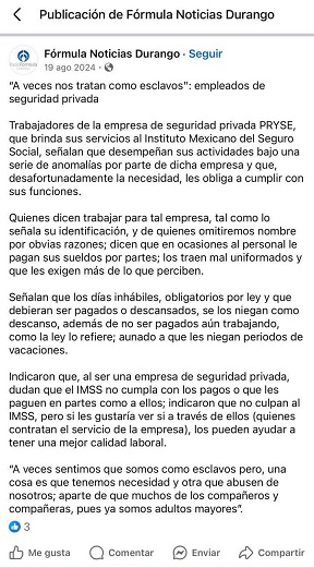 Oaxaca, Oaxaca, Sábado 05 de Abril, 2025 (Fuente: Ernesto Rojas Ayuzo, ioaxaca.com.mx, Agencia Zona Roja y Primera Línea).- Vendiéndose como un organismo que cuenta con equipos profesionales de guardias de seguridad, la empresa “Grupo PRYSE Seguridad Privada”, tiene anuncios a nivel nacional, ofertando vacantes para cubrir servicios en los diversos hospitales del IMSS Bienestar.