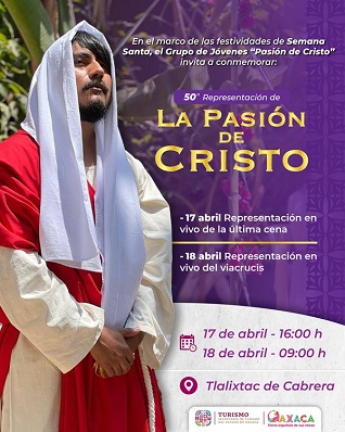 Oaxaca, Oaxaca, Sábado 12 de Abril, 2025 (Fuente: Comunicado).- La Secretaría de Turismo (SECTUR) Oaxaca, extiende una invitación a la población en general para asistir a la 50 edición de la tradicional Pasión de Cristo, en Tlalixtac de Cabrera, el jueves 17 y viernes 18 de abril; que se representa cada Semana Santa desde 1975.