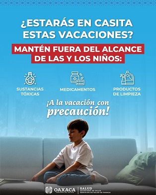 Oaxaca, Oaxaca, Jueves 17 de Abril, 2025 (Fuente: Comunicado).- Ante la temporada vacacional de Semana Santa, Servicios de Salud de Oaxaca (SSO) hace un llamado urgente a madres, padres de familia y personas cuidadoras para reforzar la vigilancia de niñas y niños en el hogar, a fin de evitar accidentes que pongan en riesgo su salud.