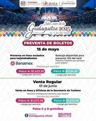 La venta regular tiene una disponibilidad del 85 por ciento del boletaje, en la que podrán adquirir hasta dos boletos por persona con tarjeta de cualquier institución bancaria en https://www.superboletos.com/, o de manera directa en las oficinas de SECTUR Oaxaca, ubicadas en avenida Benito Juárez 703, en la capital del estado.