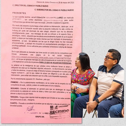 Oaxaca, Oaxaca, Sábado 10 de Mayo, 2025 (Fuente: Elizabeth Gutiérrez Martínez / X: @InquisidorOax).- A pesar de los discursos oficiales y campañas institucionales contra el acoso escolar, una alumna del Colegio de Bachilleres de Oaxaca (COBAO), 01 Pueblo Nuevo, ubicado en la capital de Oaxaca, denunció formalmente ser víctima de bullying sistemático, violencia psicológica y misoginia dentro de la institución.
