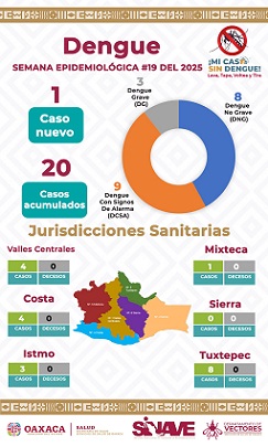 Oaxaca, Oaxaca, Jueves 15 de Mayo, 2025 (Fuente: Comunicado).- Los Servicios de Salud de Oaxaca (SSO) informa que, al corte de la semana epidemiológica número 19, se registraron 20 casos acumulados de dengue en la entidad, tras la confirmación del primer caso en la Jurisdicción Sanitaria 5 Mixteca