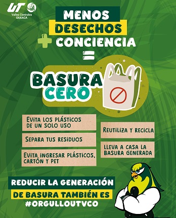 San Pablo Huixtepec, Zimatlán, Oaxaca, Lunes 02 de Junio, 2025 (Fuente: Comunicado).- La Universidad Tecnológica de los Valles Centrales de Oaxaca (UTVCO) puso en marcha el programa “Basura Cero”, iniciativa orientada a reducir los desechos generados al interior de sus instalaciones, mediante la adopción de prácticas responsables y la concientización de la comunidad universitaria.