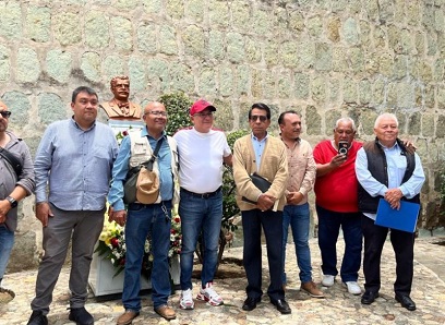 Acompañado de Miguel Ángel Luna, el otro integrante de la dirigencia de la APO, ante el busto de Ricardo Flores Magón, en la Plazuela de la Libertad de Expresión de la capital, recordó la trascendental labor del originario de Eloxochitlán.