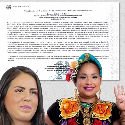 El fallo se formalizó mediante la licitación pública nacional LPN-SA-SB-0017-05/2025, solicitada expresamente por la SEBIENTI que encabeza la política social del gobierno morenista de Salomón Jara Cruz.
