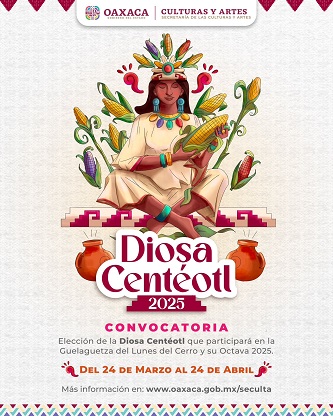Oaxaca, Oaxaca, Miércoles 11 de Junio, 2025 (Fuente: Comunicado).- La Secretaría de las Culturas y Artes (SECULTA) anuncia que el tradicional proceso de selección de la Diosa Centéotl 2025 se llevará a cabo los días viernes 20 y sábado 21 de junio, en la Plaza de la Danza de Oaxaca de Juárez.