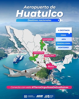 Recordó que, Huatulco cuenta con vuelos que lo conectan con el Aeropuerto Internacional de la Ciudad de México (AICM) y con el Aeropuerto Internacional Felipe Ángeles (AIFA), lo que facilita la llegada de visitantes provenientes del valle de México, así como internacionales que arriban a estas dos principales terminales del país.