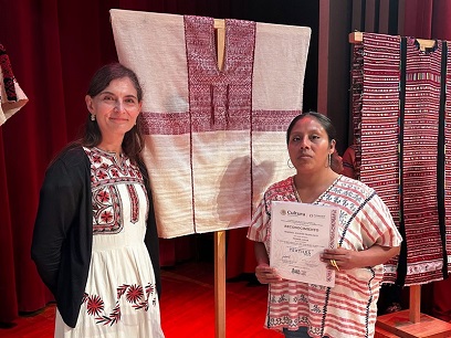 En tanto, Emiliano Cruz Mendoza de Teotitlán del Valle, de la cultura zapoteca, se alzó con el Premio especial a obra de rescate tradicional con su obra Diamante en carmín, hecho de lana y seda teñidas con tintes naturales.