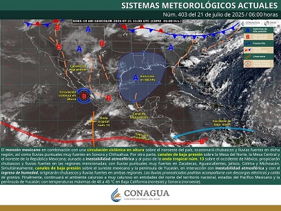 Oaxaca, Oaxaca, Lunes 21 de Julio, 2025 (Fuente: Comunicado).- La Coordinación Estatal de Protección Civil y Gestión de Riesgos (CEPCyGR) informa que, se espera la posibilidad de áreas de tormentas asociadas con actividad eléctrica en horas de la tarde y noche, al momento de la lluvia o tormenta pueden registrarse vientos lineales fuertes, acompañados con periodos cortos de precipitación en forma de chubascos fuertes.