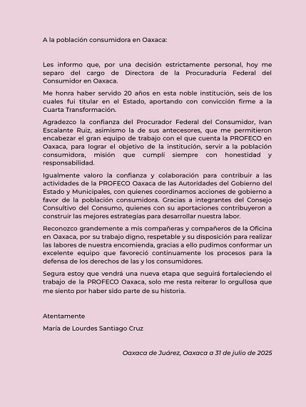 “A la población consumidora en Oaxaca: Les informo que, por una decisión estrictamente personal, hoy me separo del cargo de Directora de la Procuraduría Federal del Consumidor en Oaxaca”.